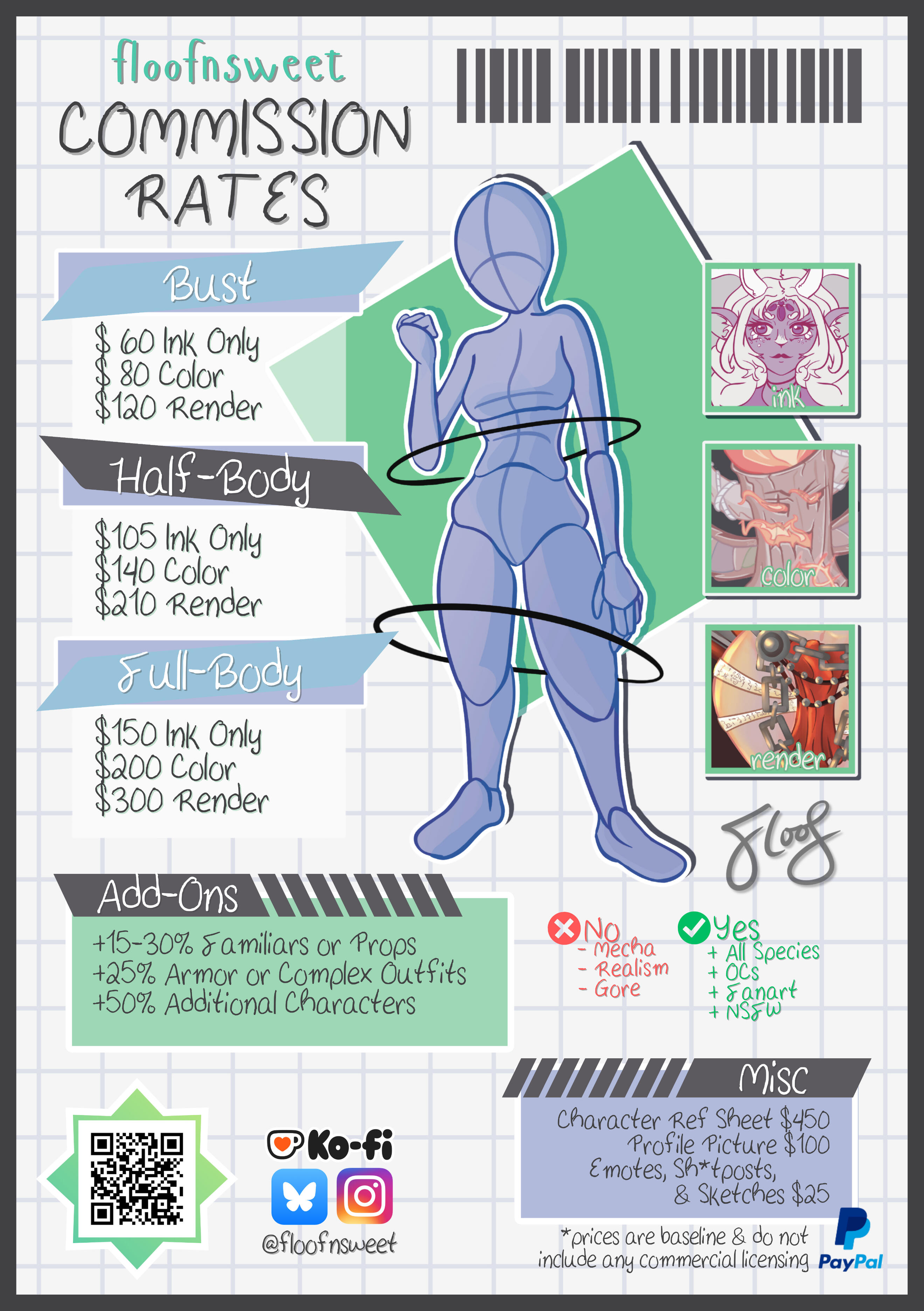 Other commissions available by request.Prices are baseline and do not include any add-ons or commercial licensing.
